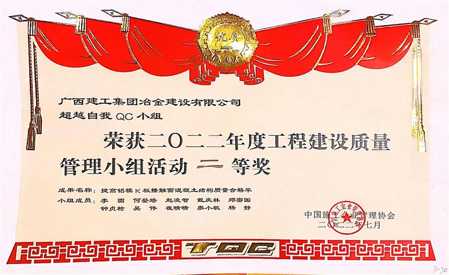 《提高鋁模K板接觸面混凝土結(jié)構(gòu)質(zhì)量合格率》榮獲2022年度工程建設質(zhì)量管理小組活動二等獎。