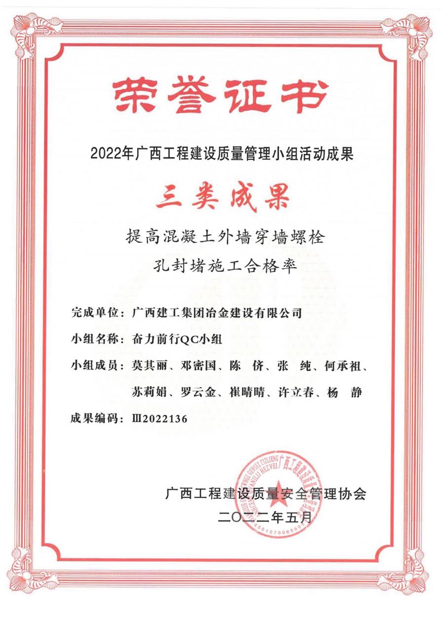 《提高預制混凝土箱涵頂進軸線偏差合格率》《提高混凝土外墻穿墻螺栓孔封堵施工合格率》榮獲2022年廣西工程建設質(zhì)量管理小組活動成果三類成果。