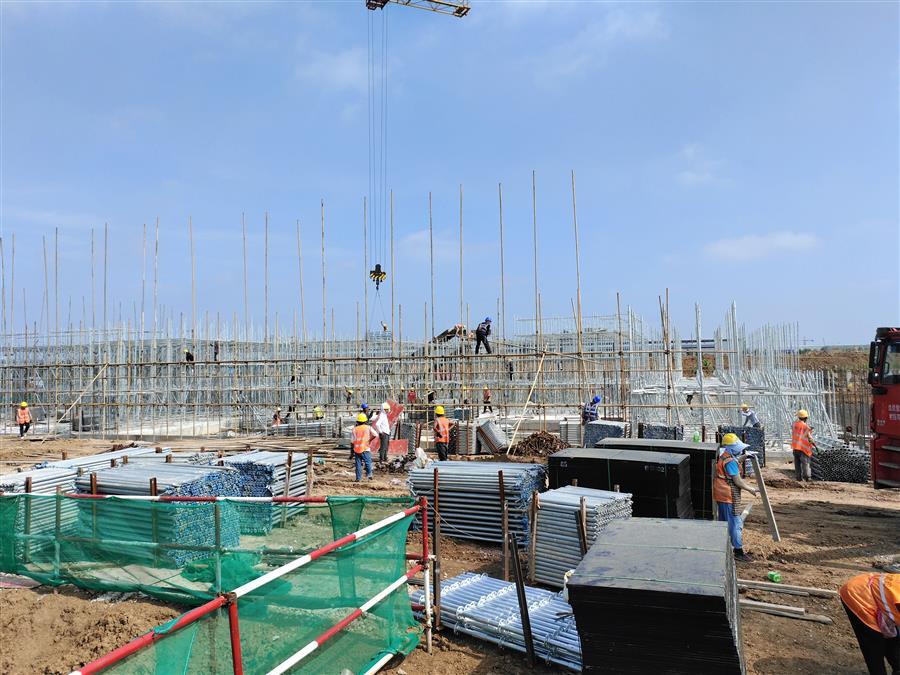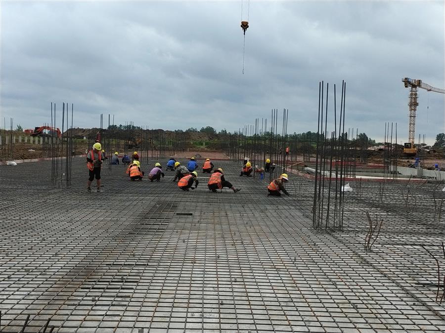 “日均投入施工技術人員500余人、各類機械設備45臺搶抓施工節(jié)點。”項目負責人禤旭云說,自6月開工以來,針對項目工期緊、任務重的情況,項目部按照“開工即攻堅、起步即沖刺”的要求,全面推進項目建設。目前,中試車間基礎回填、褥墊層鋪筑、墊層澆筑、剛性地面鋼筋綁扎完成;1#生產(chǎn)車間53~56軸獨基開挖基礎承臺鋼筋綁扎、模板安裝、砼澆筑完成,48~52軸基礎開挖、墊層澆筑完成;2#生產(chǎn)車間18~25軸基礎承臺鋼筋綁扎、模板安裝、砼澆筑完成;倉庫基礎梁全部完成。