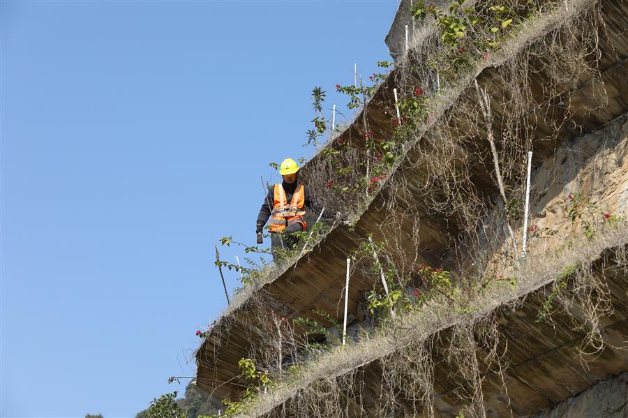 12月19日,一名工人在峭壁上護(hù)理綠植。