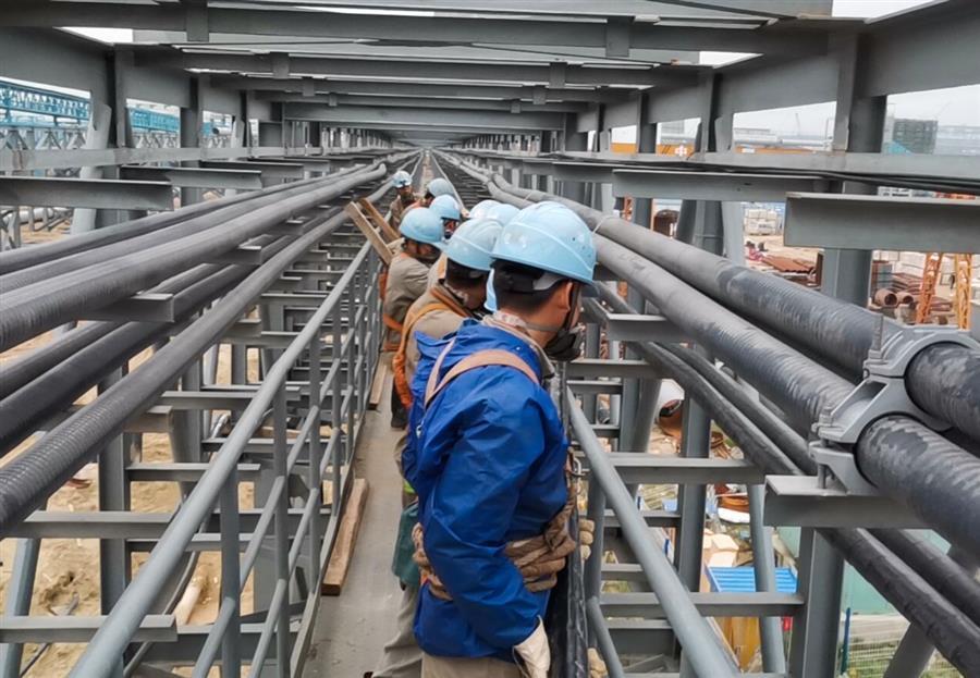 在防城港鋼鐵基地項目(一期)動力系統(tǒng)電力設(shè)施工程——10kV電力電纜敷設(shè)項目施工現(xiàn)場,工人們各司其職、齊心協(xié)力,努力推進(jìn)項目建設(shè)。