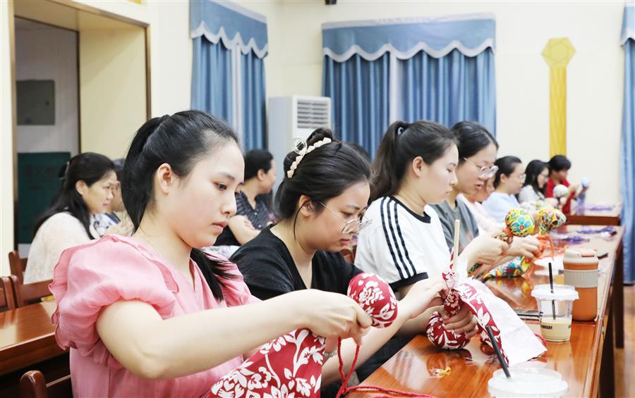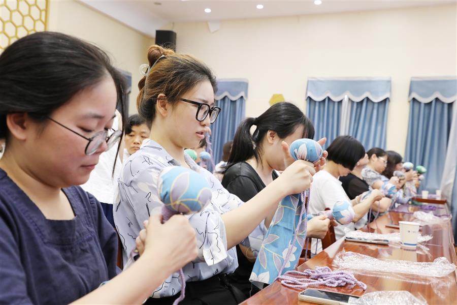 課堂上,培訓(xùn)老師王春梅為大家詳細講解了艾草養(yǎng)生錘的功效和用途,并演示了其制作方法和步驟。“將錘柄插入艾草包,拉緊艾草包,然后將其放在布料三分之一處,捏成一個緊實的圓球……”在王老師的指導(dǎo)下,女職工們積極參與,跟著老師的指導(dǎo)一步一步地制作自己的養(yǎng)生艾草錘。大家認真細致的聽講并按步驟制作,不久一把把色彩鮮艷、質(zhì)量上乘的艾草養(yǎng)生錘相繼“出爐”。大家互相試用,現(xiàn)場洋溢著歡聲笑語。